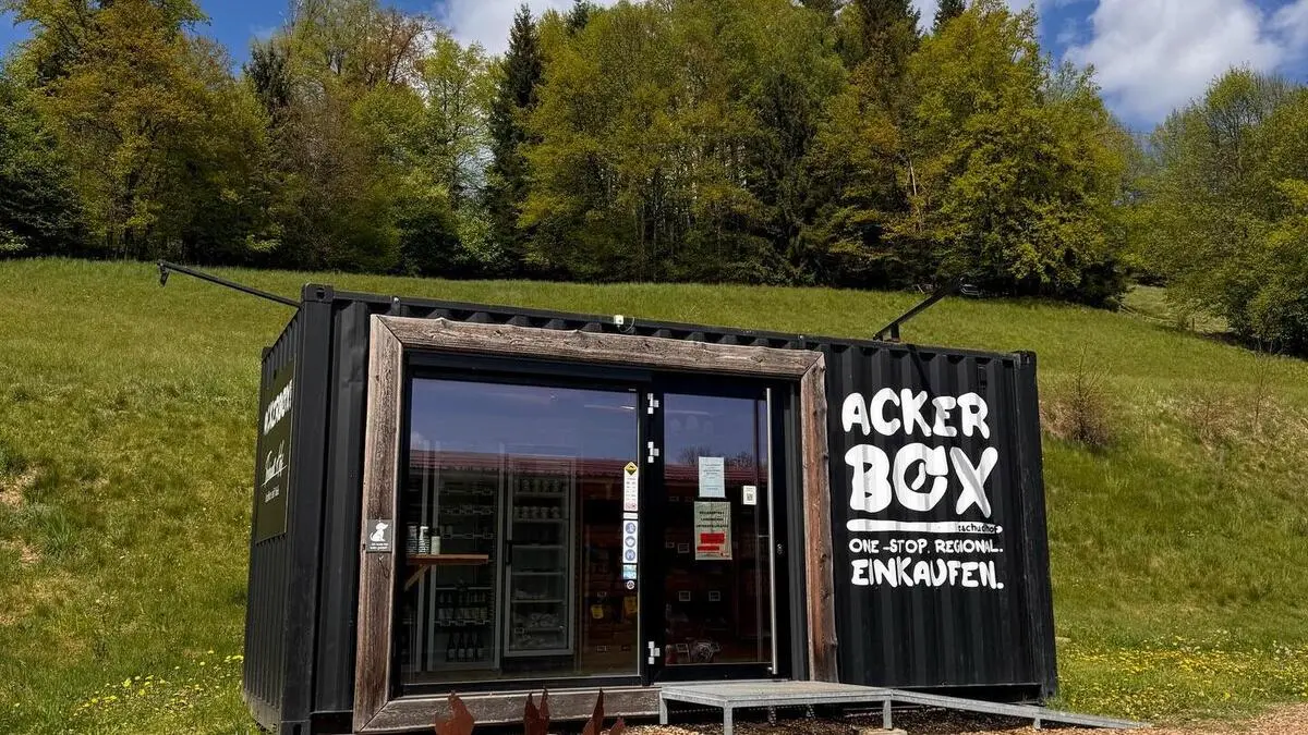 Blick auf einen Verkaufscontainer mit der Aufschrift „Ackerbox“, die an einem Hang steht, im Hintergrund erheben sich Bäume