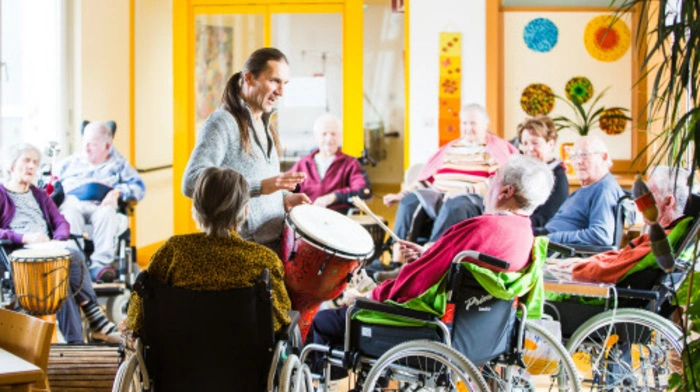 Von „Alle meine Entlein“ bis „In die Berg bin i gern“: Hans Walluschnig trommelt sich mit den Patienten der Geriatrie im LKH Villach zur Entspannung. Musik und Spaß als Therapieform.