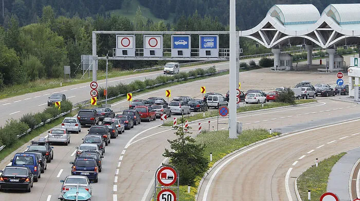 Kolonne vor dem Karawankentunnel. Auf der Tauernautobahn gab es einen 20 Kilometer langen Stau Richtung Slowenien. Die Wartezeit betrug 90 Minuten.