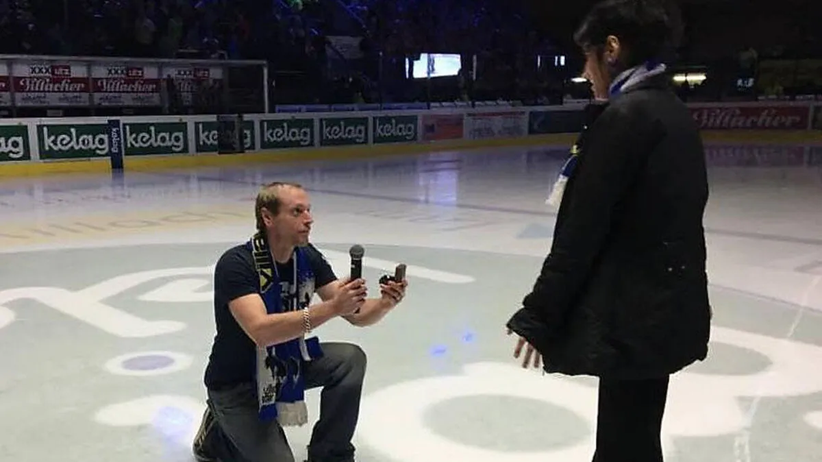Heiratsantrag in der Villacher Stadthalle: VSV-Fan Wolfgang hat in der Drittelpause um die Hand seiner Sharma angehalten.
