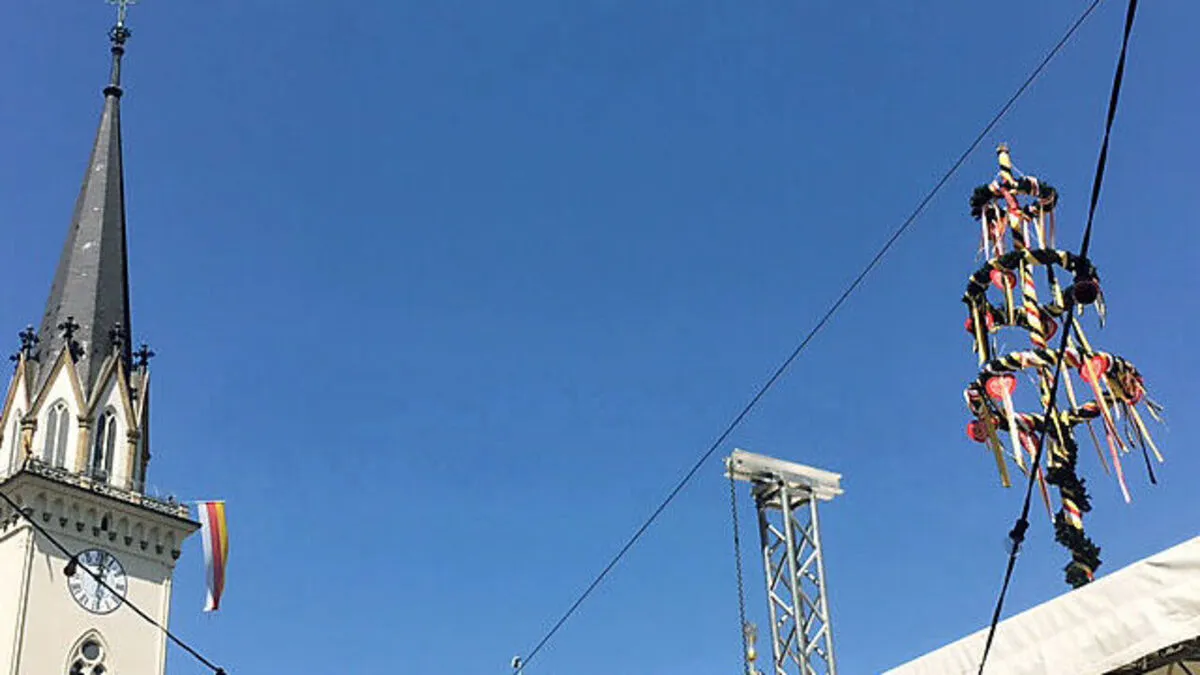 Die Veranstalter sind ob starker Windböen besorgt und kappten die Spitze des Kirchtagsbaumes.