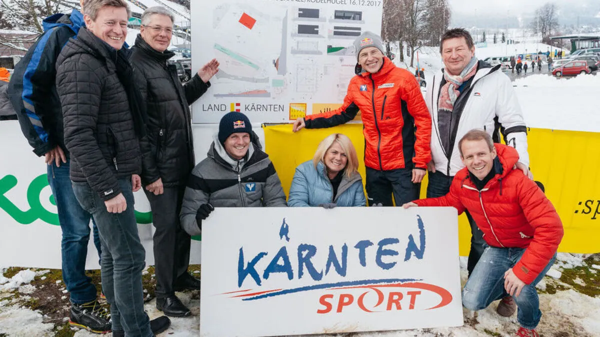 Landeshauptmann Peter Kaiser, Vizebürgermeisterin Gerda Sandriesser und Alpen Arena Obmann Gemeinderat Dipl.-Ing. (FH) Andreas Sucher mit den beiden Skisprung-Olympiasiegern Andreas Goldberger und Thomas Morgenstern sowie Unterstützern des Projektes und Nachwuchsportlern