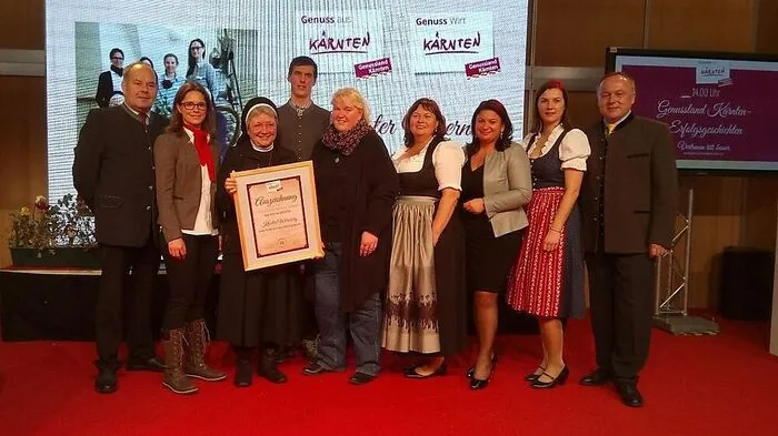 Schwester Oberin Johanna, Betriebsleiterin Karin Hermann, Gudrun Ebner (Leiterin Klostergarten) und Landwirt Sebastian Perwein nahmen die Auszeichnung entgegen
