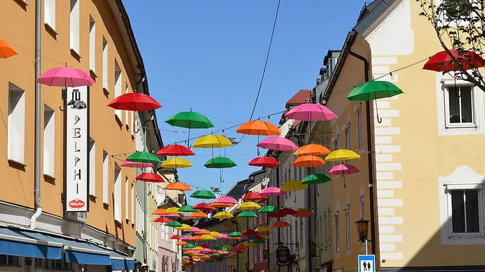 Bunte Schirme bringen Farbe in Villachs Innenstadt