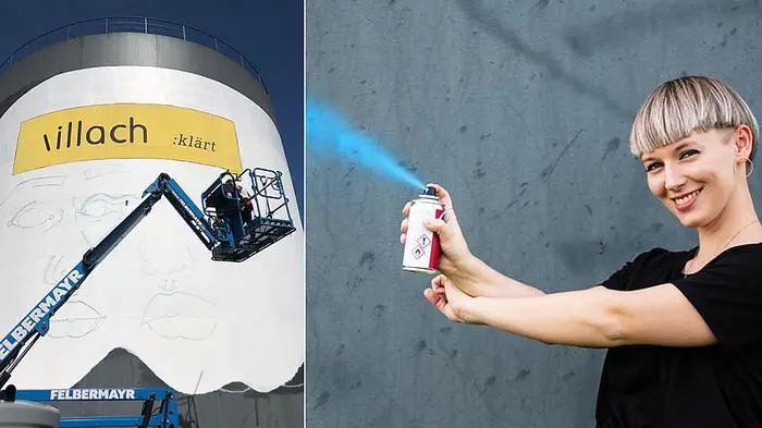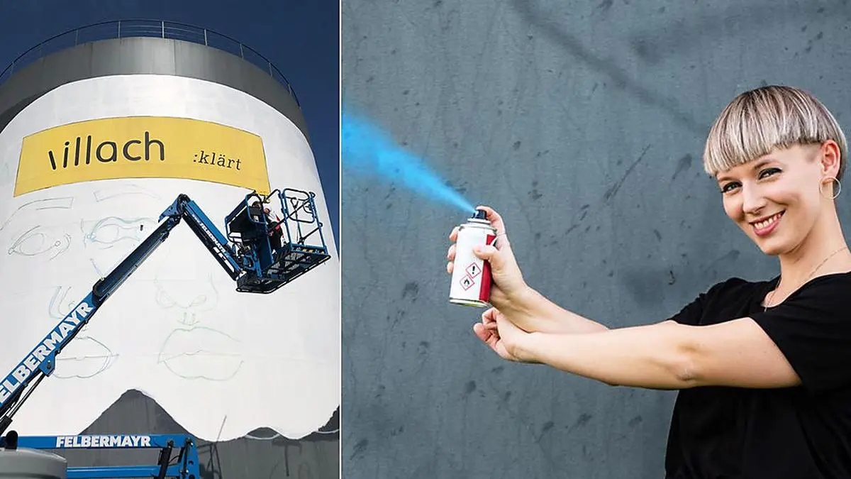 Vor einigen Monaten startete die Stadt Villach eine Offensive, um die moderne Kunstform Streetart sichtbar zu machen. Derzeit entsteht das Leuchtturmprojekt der Initiative, das wohl größte Kunstwerk dieser Art in Kärnten: Die Villacher Künstlerin Pia Dalitz, die den Ideenwettbewerb gewonnen hat, bearbeitet in spektakulärer Weise den 16 Meter hohen Gasturm der Kläranlage in St. Agathen mit Hilfe von Hebekran, viel Farbe und Kollegen Nino Weld. Insgesamt wird ihr Kunstwerk nach der Fertigstellung eine Fläche von 600 Quadratmetern bedecken.