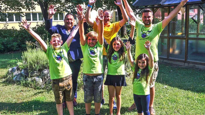 Gemeinderat Herbert Rader, Stadtkapelle-Obmann Martin Brandstätter, dem musikalischen Leiter Sandro Wanker und einige der Kinder