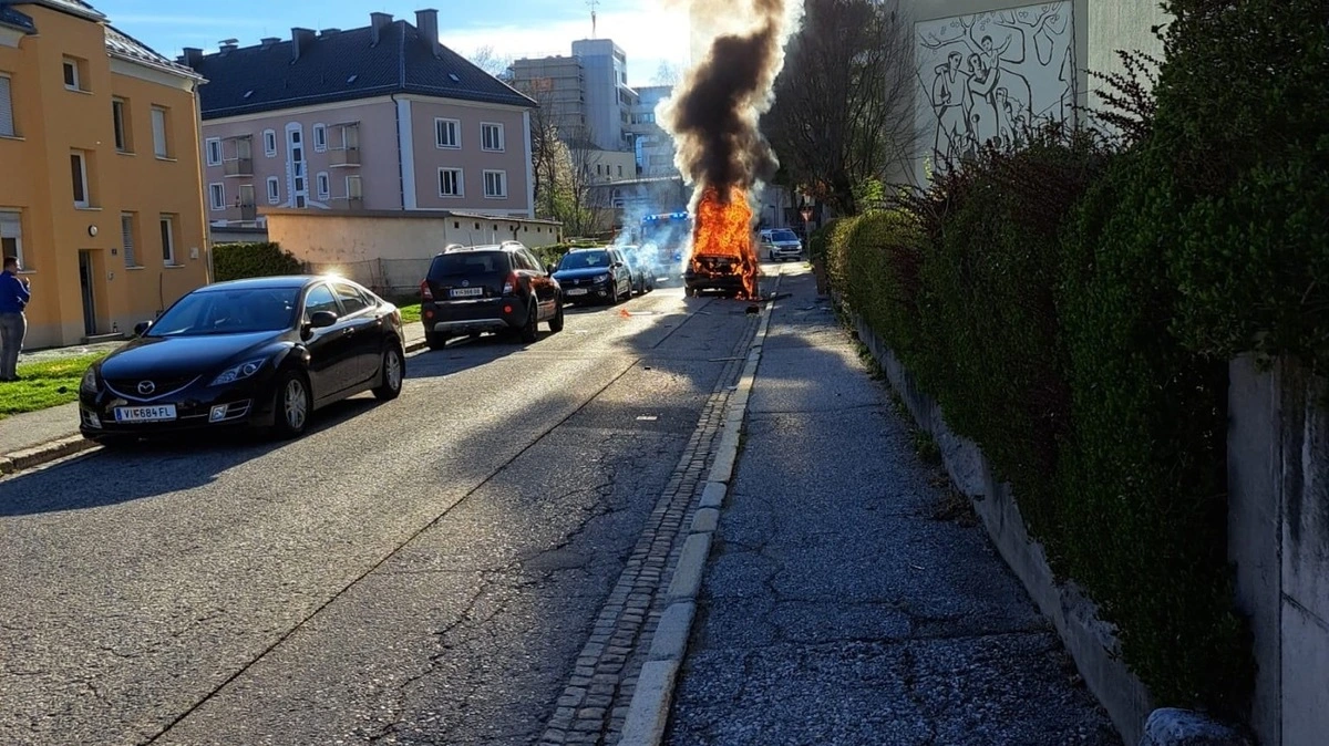 Spektakulärer Brand am Ostermontag in Villach. In einem Auto explodierte eine mitgeführte Gasflasche. Ein Mann wurde verletzt.