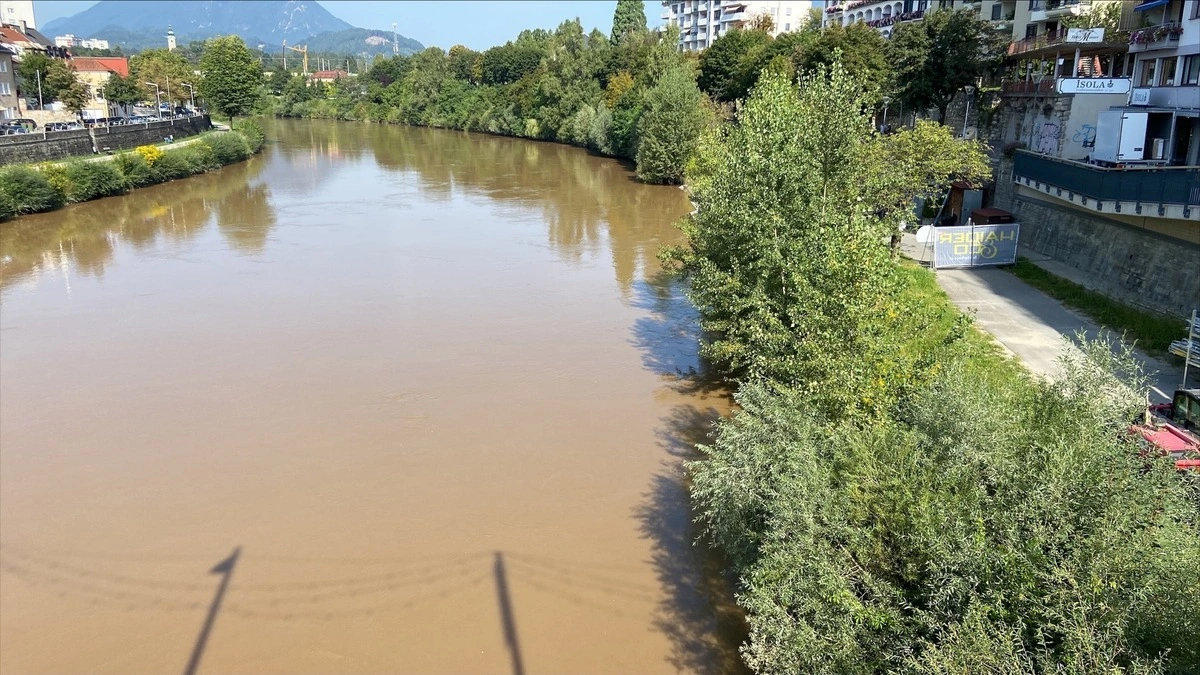 Das Wasser der Drau in Villach präsentiert sich nach den Unwettern in Oberkärnten braun verfärbt. Gefahr für Fische besteht nicht.