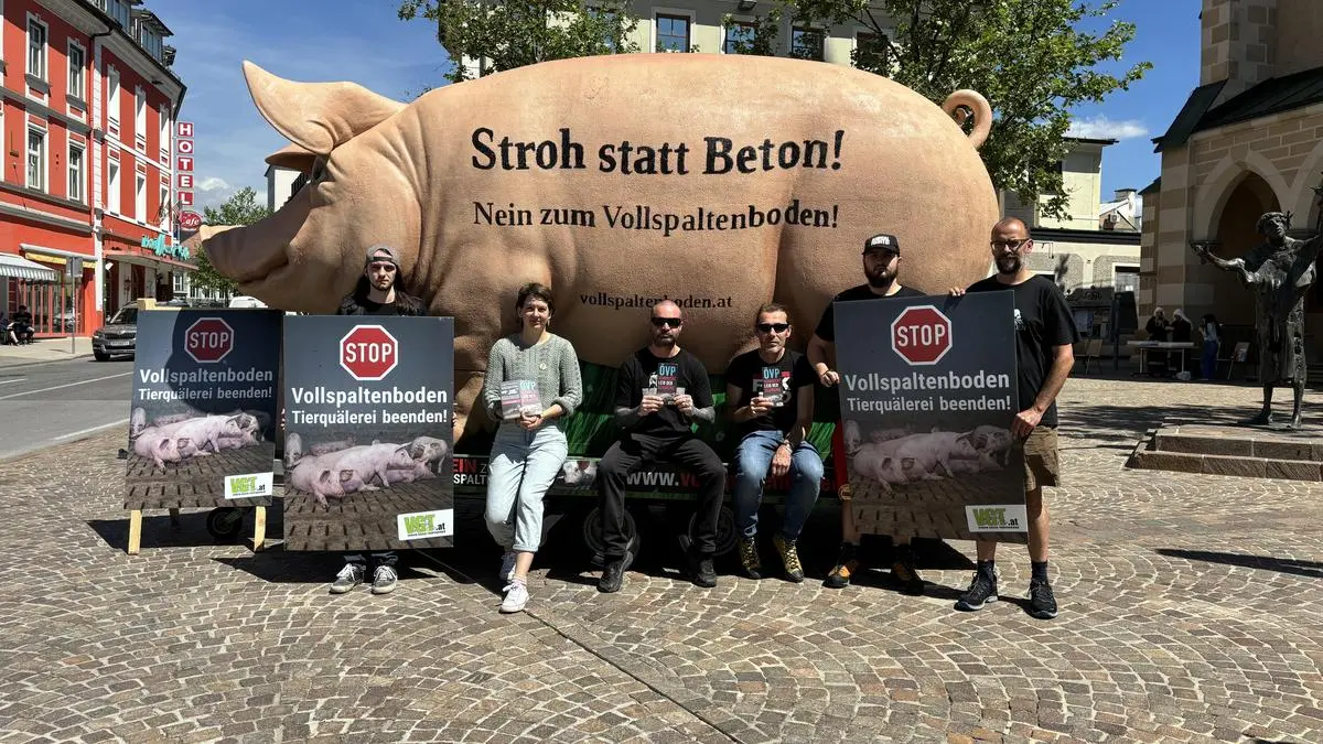 Am Freitag fand in Villach eine ungewöhnliche Protestaktion statt. Der VGT (Verein gegen Tierfabriken) demonstrierte mit einem fünf Meter großen Schwein mitten in der Innenstadt.