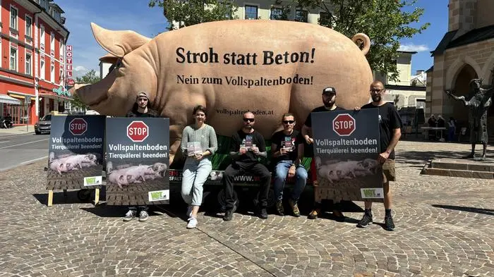 Passantinnen und Passanten waren in Villach am heutigen Freitag verblüfft. Auf dem Nikolaiplatz in der Innenstadt stand ein fünf Meter großes Schwein. Dieses, „Gunzi“, sollte im Rahmen einer Protestaktion des „Verein gegen Tierfabriken“ VGT auf das „gerechte, ökologisch- und ethisch verantwortungsbewusste Zusammenleben aller Lebewesen und auf das Leid der Schweine auf Vollspaltenböden“ aufmerksam machen.