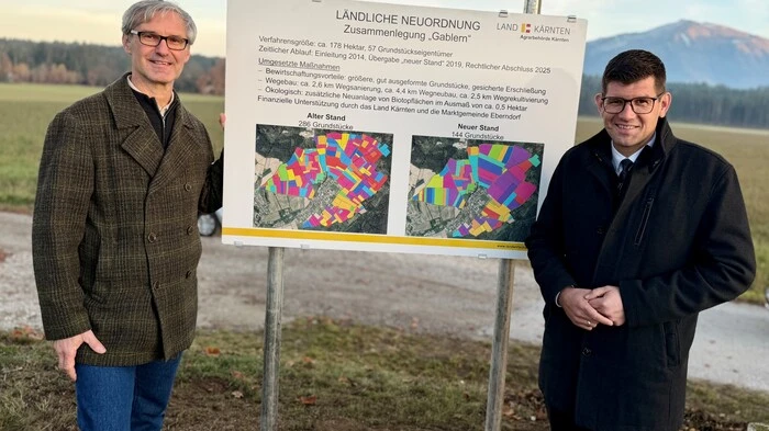Nach mehr als zehn Jahren ist ein komplexes landwirtschaftliches Zusammenlegungsverfahren in Gablern in der Marktgemeinde Eberndorf formell abgeschlossen. Seit der Einleitung des Verfahrens wurden rund 180 Hektar landwirtschaftliche Nutzflächen neu geordnet. „Damit erleichtern wir die Bewirtschaftung und verbessern die Erschließung der Flächen maßgeblich. Das entlastet unsere Landwirte, steigert die Effizienz und stärkt zudem die regionale Entwicklung“, sagt Agrarreferent und Landeshauptmann-Stellvertreter Martin Gruber (ÖVP) im Zuge der Abschlussveranstaltung in Eberndorf. Neben Gruber nahmen auch Bürgermeister Wolfgang Stefitz (SPÖ), Vizebürgermeister Friedrich Wintschnig (ÖVP), Obmann der Zusammenlegungsgemeinschaft Helmut Wutte, Operationsleiter Thomas Komar sowie weitere Gemeindevertreter und Projektverantwortliche an der Veranstaltung teil.