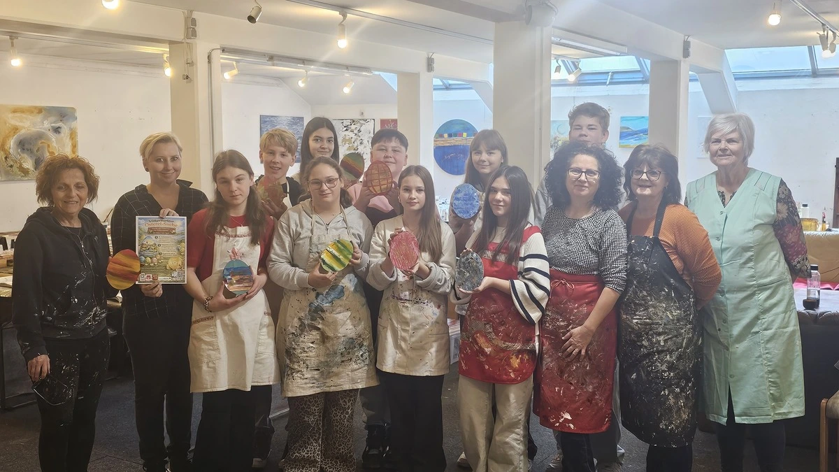 Schüler der Mittelschule Völkermarkt mit Mitgliedern des Kunstvereins Art13 und den bemalten Ostereiern in den Händen