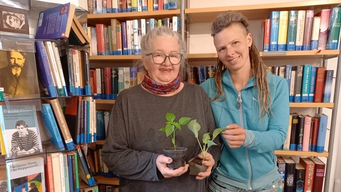 Zwei Frauen mit Pflanzen in der Hand, im Hintergrund sieht man Regale voller Bücher