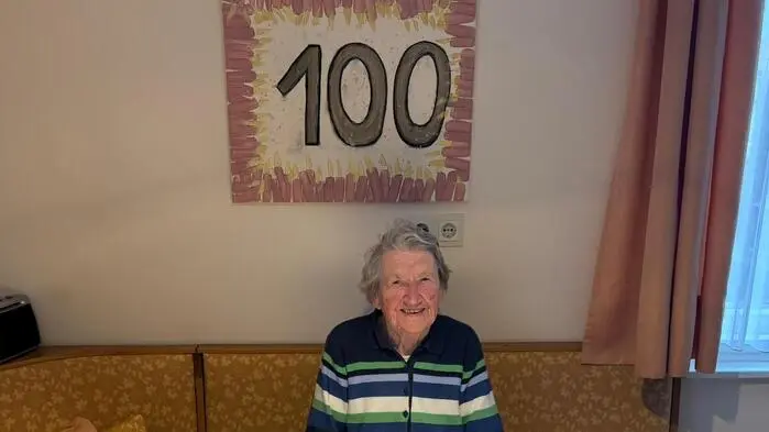 Eine Frau mit grauen Haaren sitzt hinter ihrem Küchentisch, über ihr ist ein Bild auf dem die Zahl 100 steht