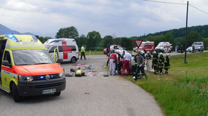 Drei Motorräder waren auf dem Weg nach Kärnten, als kurz nach der Grenze ein Auto, voll besetzt mit Kinder, von rechts kam. Es kam zum Frontalzusammenstoß, wobei ein Motorradfahrer schwer verletzt wurde.