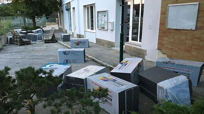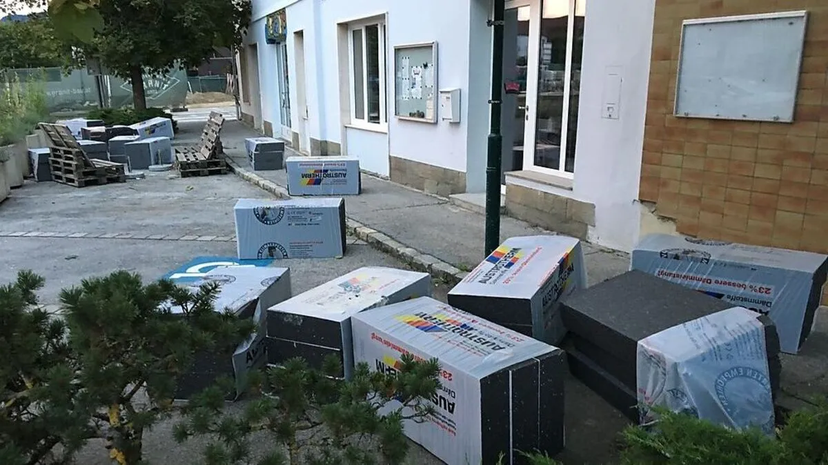 Montagabend warf ein Sturm in der Völkermarkter Innenstadt bei der Baustelle am Postplatzl einen Bauzaun um und verwehte Dämmmaterial bis in umliegende Gärten.