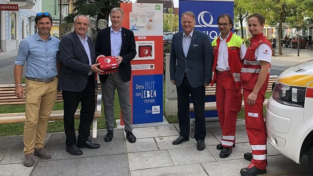 Die dritte Uniqa-Defibrillator-Säule wurde am Dienstag auf dem Völkermarkter Hauptplatz aufgestellt. Es ist dies die dritte ihrer Art in Kärnten.