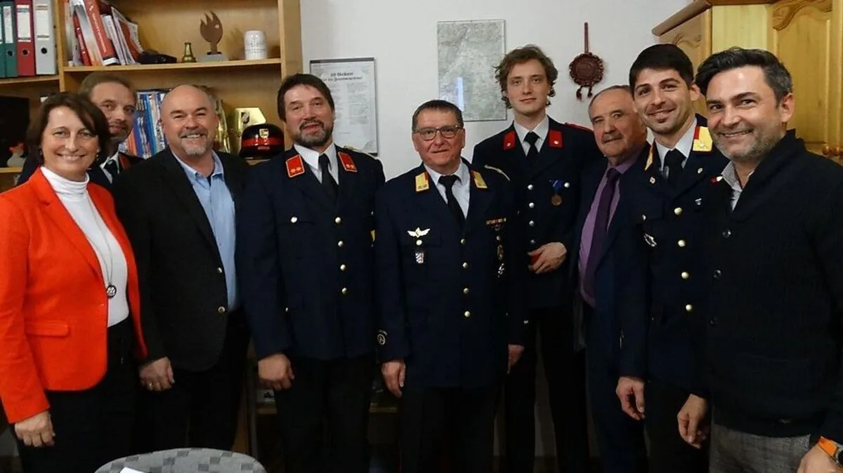 GR Angelika Kuss Bergner, StV-FF Kdt BI Seppi Dreier, StR Gerald Grebenjak, Kdt OBI Michael Dreier, BR Werner Opetnik, Oberfeuerwehrmann Daniel Dreier, Bgm Valentin Blaschitz, Abschnittskommandant ABI Rahman Ikanovic, Vbgm Markus Lakounigg (von links)