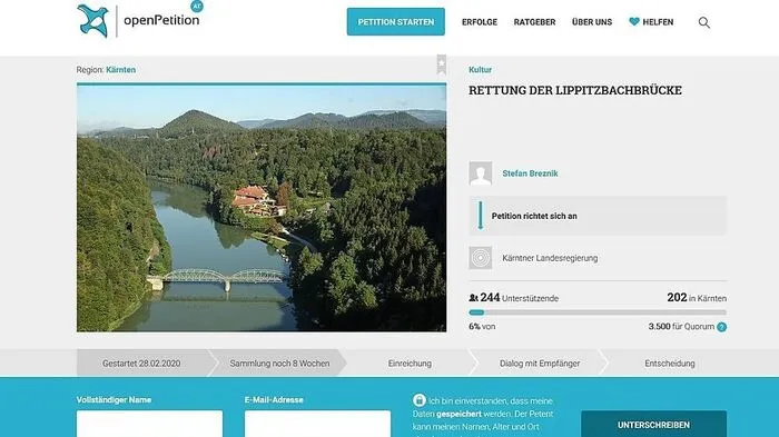 Die angekündigte Petition für den Erhalt der Lippitzbachbrücke ging Freitagvormittag online. Wenn 3500 Unterschriften vorliegen, wird Stellungnahme von Behörde eingefordert.