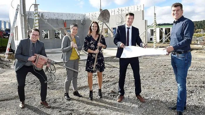 Das künftige Team Gregor Krainz, Iris Wohlgemuth und Martina Jandl mit Kevin Müller (Teamleiter Jauntal) und MID Bau-Bauleiter Thomas Visotschnig (von links)