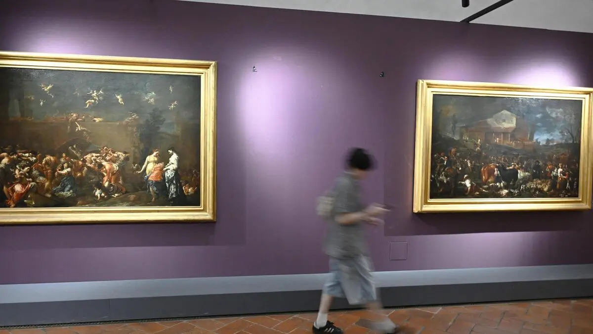 Ein Besucher hat sich für ein Foto an ein barockes Porträt gelehnt, bis die Leinwand nachgab.