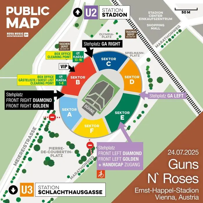Drei Jahre nach ihrer letzten Show im Ernst Happel Stadion gastiert Guns N‘ Roses wieder in Wien. Das Konzert der Rockstars um Frontman Axl Rose und Gitarrist Slash findet im Rahmen ihrer „Because What You Want & What You Get Are Two Completely Different Things“-Tour statt. Die Fans dürfen sich auf ein langes Set mit den größten Hits der Band freuen. Wir haben die wichtigsten Infos zum Guns N‘ Roses Konzert am 24. Juli für euch zusammengefasst: