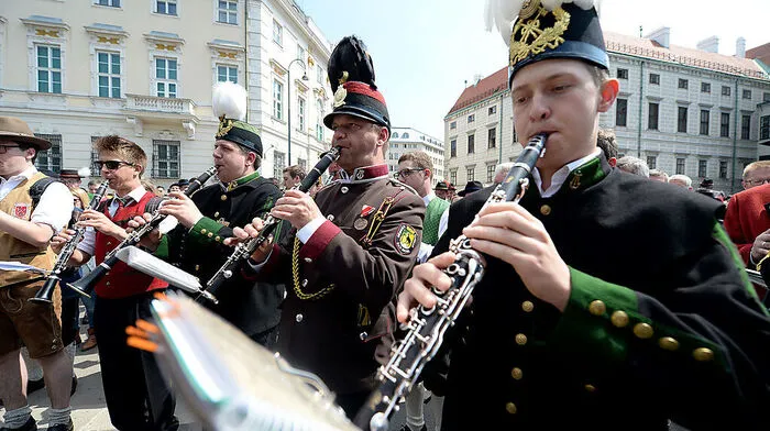 Die Militärmusikkapellen marschierten auf dem Ballhausplatz auf, um mit einem Sympathie-Konzert gegen die geplanten Einsparungen zu protestieren. Dabei kam durchaus auch Volksfeststimmung auf.