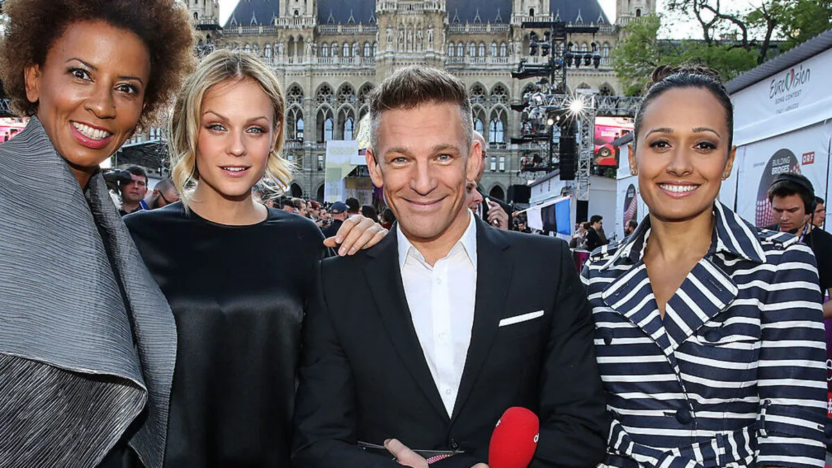 Andi Knoll und das Moderatorinnentrio des Song Contests