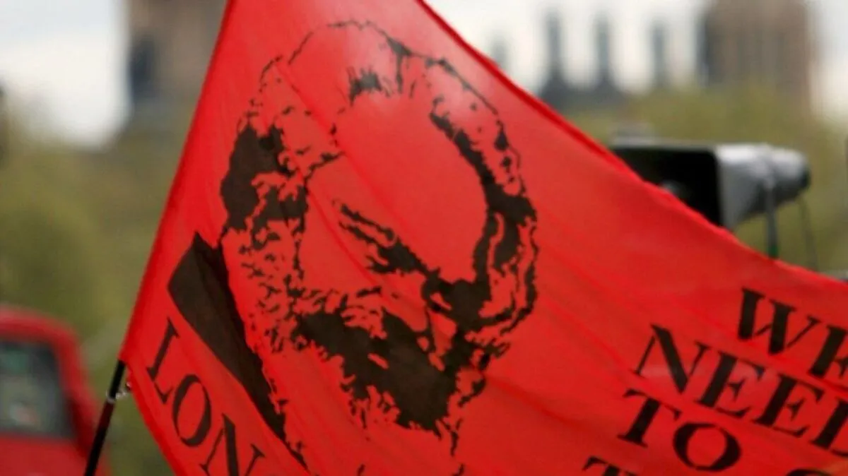 Karl Marx-Flagge bei einer Arbeiterkundgebung in Großbritannien