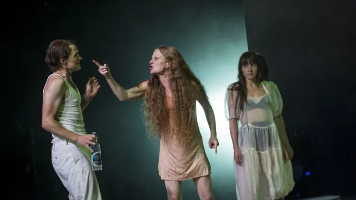 Rosa Thormeyer (links) und Oda Thormeyer (rechts) als Iphigenia, Sebastian Zimmler spielt einen Agamemnon des Jahres 2022.