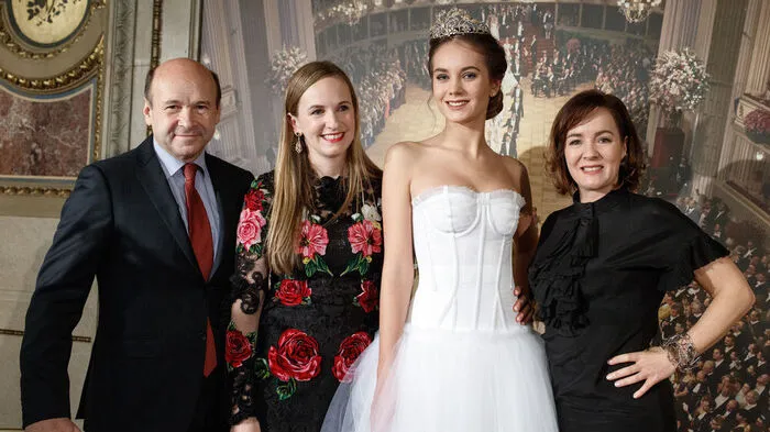 Operndirektor Dominique Meyer, Opernball-Organisatorin Maria Großbauer, Debütantin mit Tiara und Birgit Berthold-Kremser von Swarovski im Rahmen der Präsentation der Swarovski-Tiara für den kommenden Opernball in der Staatsoper in Wien