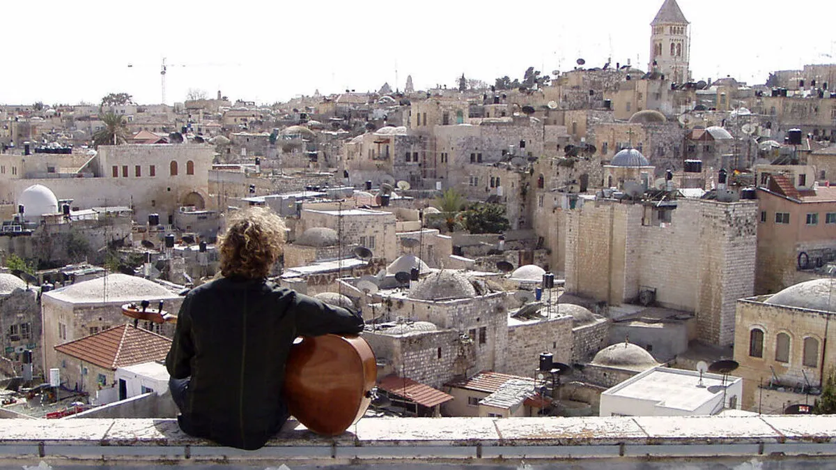 Cellist und Impresario Erich Oskar Huetter über den Dächern der Altstadt von Jerusalem