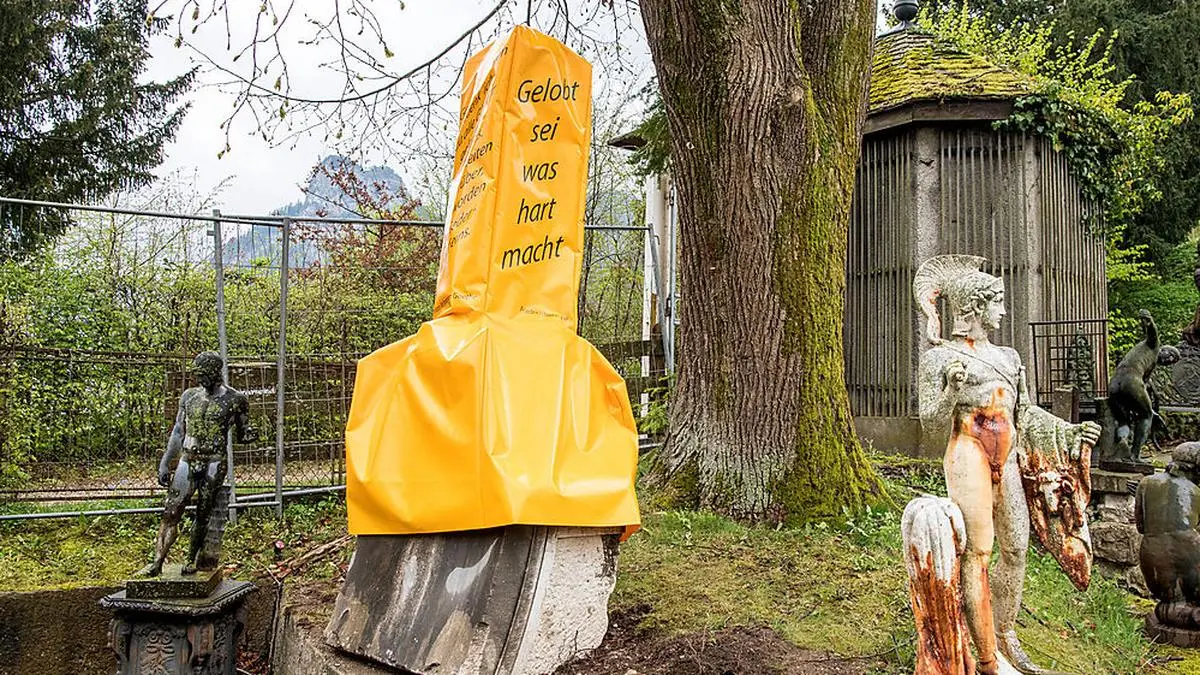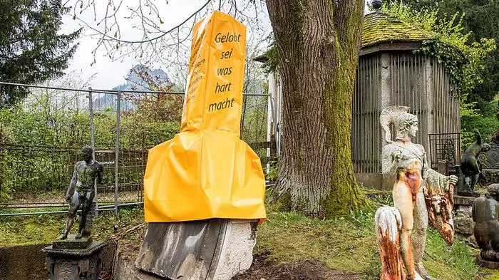 Die Teilnehmer des traditionellen Traunkirchner "Antlaß-Singens" in der Nacht auf Freitag sowie jene der Karfreitagsprozession müssen nicht an einem zwei Meter hohen Phallus vorbeiziehen. Die Statue neben einem Kreuzweg wurde Donnerstagnachmittag mit einer gelben Plane verhüllt. Darauf prangt nun allerdings ein Spruch von Friedrich Nietzsche: "Gelobt sei was hart macht".