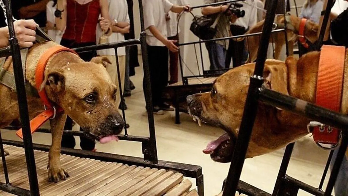 Zwei Pitbull-Hunde, die erfolglos versuchen, übereinander herzufallen: aus der Ausstellung entferntes Video von Sun Yuan und Peng Yu.