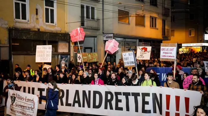 Starke Präsenz zeigte die steirische Kulturszene am Donnerstag bei einem Protestzug durch Graz: Tausende schlossen sich einer so bunten wie lautstarken Demonstration gegen dramatische Förderungskürzungen und die Neubestellung des Kulturkuratoriums durch die FP-VP-Landesregierung an (wir berichteten). Auffällig: Offenbar hatte sich viel Kulturpublikum mobilisieren lassen. Vom Europaplatz vor dem Hauptbahnhof bis zur Abschlusskundgebung auf dem Hauptplatz wuchs die Zahl der Beteiligten laut polizeilicher Schätzung von „jedenfalls 500“ auf mehr als 2000 an; dem Organisationsteam zufolge waren sogar 2500 dem Ruf „Kulturland retten!“ gefolgt.