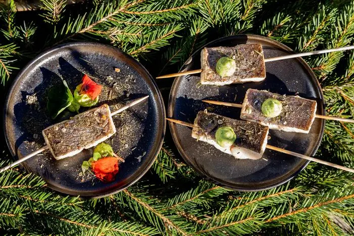 Granegger lacht, wenn man ihn fragt, ob Fisch und Wald nicht eine seltsame Kombination seien. „Im Kopf passt’s nicht zusammen, aber im Mund schon.“ Etwa beim gegrillten Saibling, der mit einer Gewürzmischung aus Wacholder, Flechten und wildem Thymian eingerieben wird. Wenn der Fisch über der Glut liegt und das Harz zu duften beginnt, dann ist das kein Kochvorgang, das ist ein Kurzurlaub in der Nase.