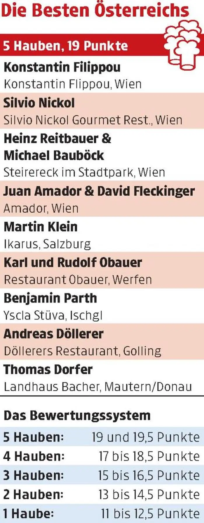 Die heimische Spitze bleibt konstant stark: Harald Irka und Gerhard Fuchs zählen weiterhin zu den führenden Vertretern der österreichischen Gourmetszene. Ihre Häuser – „Irka am Pfarrhof“ und „Die Weinbank“ – behaupten mit jeweils 18,5 Punkten und vier Hauben eindrucksvoll ihre Stellung unter den besten Restaurants des Landes.