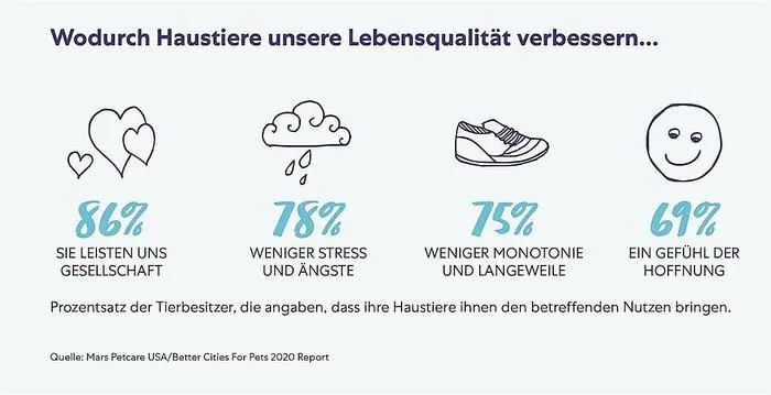 Ob sie uns Gesellschaft leisten oder uns ablenken, Hunde und Katzen helfen in einer schwierigen Zeit vielen Menschen, ihr Leben zu bewältigen, wie eine Umfrage von Mars Petcare unter Tierbesitzern in den USA ergab. 86 Prozent schätzen die Gesellschaft ihrer Haustiere, 78 Prozent leiden weniger unter Stress oder Angstgefühlen, 75 Prozent empfinden dank Haustier weniger Monotonie oder Langweile und für 69 Prozent bedeutet ihr Tier ein Gefühl der Hoffnung. Wer einen Hund hat, muss mit diesem nach draußen gehen. Das regelmäßige Spazierengehen fördert nachweislich die Gesundheit von Hundebesitzern: Sie machen mehr Bewegung und können so Risikofaktoren wie Übergewicht und Bluthochdruck entgegenwirken, zeigte eine Analyse der American Heart Association. Auch das Immunsystem profitiert von der Bewegung an der frischen Luft. Bei Kindern könne der frühe Kontakt zu Haustieren das Allergierisiko senken: Eine Studie aus Detroit hat zum Beispiel gezeigt, dass Kinder, die mit Katzen aufwachsen, als Erwachsene nur halb so häufig eine Katzenhaarallergie entwickelten wie Kinder ohne Stubentiger. Vor allem das erste Lebensjahr sei für die Prägung des Immunsystems sehr wichtig, in dieser Zeit sollte man Kindern den Kontakt zu Tieren ermöglichen. Zahlreiche kamen auch erst durch die Pandemie auf die Idee, einem Haustier ein Zuhause zu geben. Hier ist jedoch Vorsicht geboten, da der tierische Mitbewohner viele neue Aufgaben und Pflichten mit sich bringt und auch ganz neue Anforderungen an die Wohn- und Lebenssituation seiner Besitzer stellt. Deswegen sollte man sich vorab gut informieren und in die Materie einlesen, außerdem sollten alle Familienmitglieder einverstanden sein.