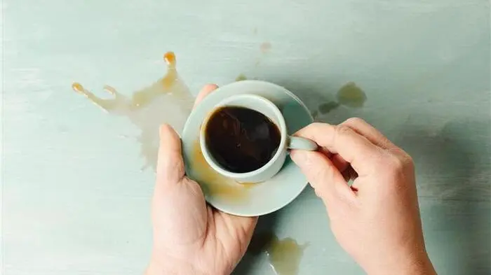 Zitternde Hände, die Kaffee aus einer Tasse verschütten