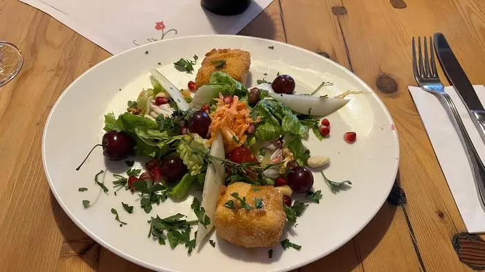 Wir entschieden uns für einen Salat mit frittiertem Ziegenkäse, Früchten und Nüssen sowie einem Carpaccio vom heimischen Hirsch mit Gebäck. Der Salat war knackig frisch, bunt und erfrischend, der Ziegenkäse genau richtig lauwarm. Obst und Nüsse fanden sich auch auf dem Carpaccio, das von köstlichem, selbst gebackenem Ciabatta-Brot begleitet wurde. Frisch zubereitete, noch heiße Fladenbrot-Ecken mussten unbedingt verkostet werden.