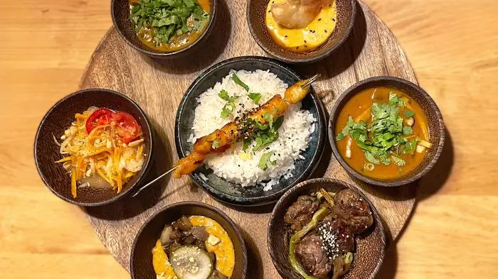 Beim Hauptgang entscheiden wir uns beide für die „Reise durch Asien, Surf and Turf, Rind und Garnele“ mit fünf kleinen Gerichten (49 Euro). Die Überraschung: Es werden nicht fünf, sondern gleich sieben Gerichte serviert und die sind nicht wirklich klein. „Es kommen auch viele Einheimische. Niemand soll hungrig aufstehen“, sagt Marvin Wimmer später. Die einzelnen Gerichte lassen tief eintauchen in die asiatische Genusswelt, „Geschmacksexplosionen“ zu erzeugen ist das Ziel. Das gelingt vielfältig und vielschichtig: von der Tempura-Garnele mit asiatischer Sauce Tatare, einem thailändischen Schwammerlgulasch, rotem Kürbiscurry, einem Garnelenspieß mit Kokosmarinade auf Jasminreis, Salat mit Karotten und Kohlrabi, eingelegter Gurke mit Auberginen und Erdnusssauce bis zu Rindfleischbällchen mit Stangensellerie, die durch ausgeprägte Röstaromen überzeugen.