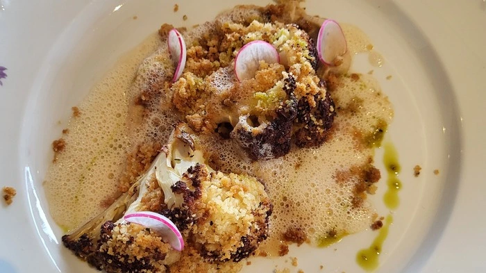 Karfiol mit Butterbröseln, Karfiolcreme und Nussbutter-Espuma