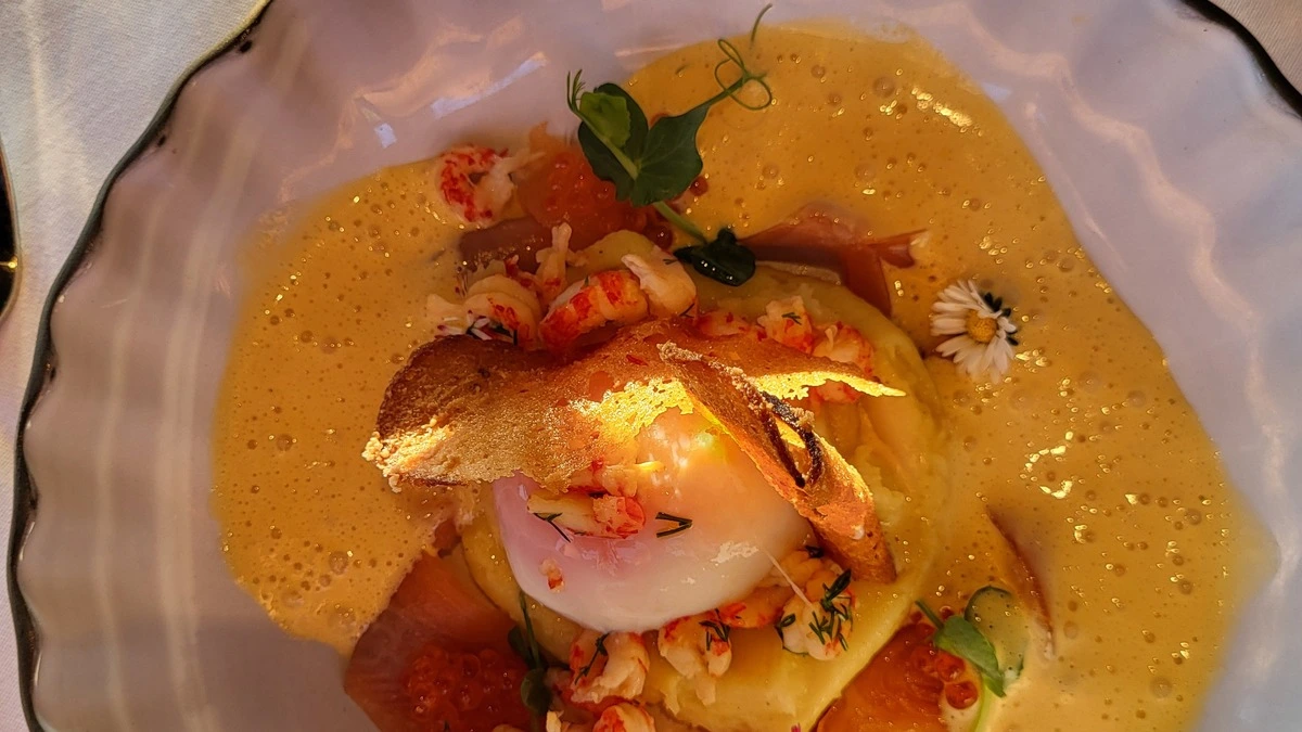 St. Petersburger Ei, Saiblingsstreifen und Erdäpfelpüree.