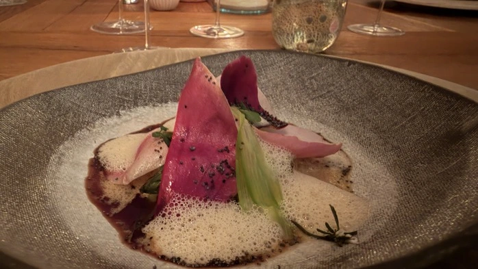 Saiblingsschwanz, Magnolie, geräucherte Buttermilch, Kernöl und grüner Spargel.