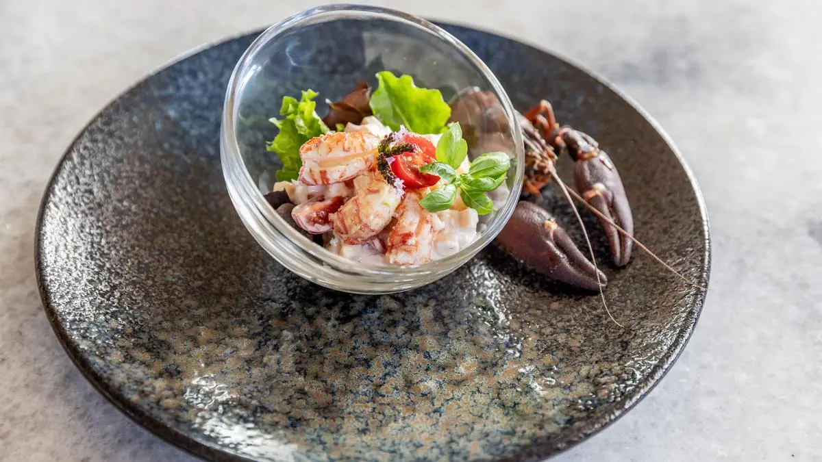 Die Cocktailsauce mit den Jungzwiebeln, den Tomaten und den Apfelwürfeln vermengen, abschmecken und die Krebsschwänze untermischen. Eine Glasschale mit in kleine Stücke gezupftem Salat auslegen, den Cocktail einfüllen. Mit zwei Flusskrebsschwänzen, Dill und einer Zitronenspalte garnieren. Mit Knoblauchbaguette servieren.