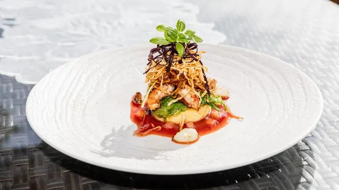 Einen Esslöffel Tomatensauce in der Mitte der Teller positionieren. Die goldbraun gebratenen Polentataler daraufsetzen, mit sautieren Blattspinat belegen und die gebratenen Krebsschwänze oben aufsetzen. Mit frittierten Gemüsejulienne garnieren.