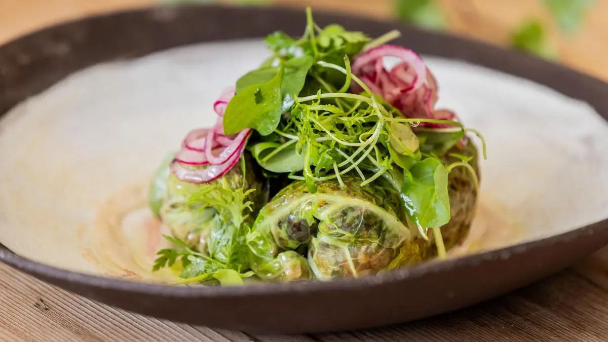 Beim Anrichten Tahinsauce auf Tellern verteilen, darauf die Rouladen platzieren. Kräutersalat und Sumach Zwiebeln auf die Rouladen drapieren.