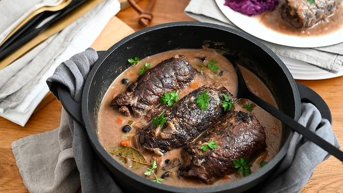 5. Vor dem Servieren Rouladen und Gewürze aus der Soße nehmen und die Soße mit einem Pürierstab fein pürieren (oder wer es etwas feiner mag: die Soße durch ein Sieb zurück in den Bräter geben). Die Soße nur noch mit dunklem Soßenbinder laut Packungsanweisung in die gewünschte Konsistenz bringen - fertig.
