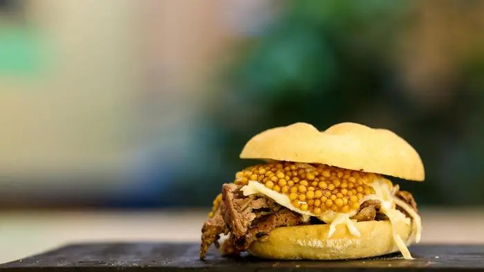 Semmel zu 2/3 aufschneiden, Mayo-Mischung auf beiden Seiten verteilen. Salat, Tomate, Zwiebel und Ochsenfetzen einlegen.
