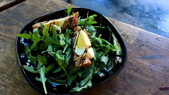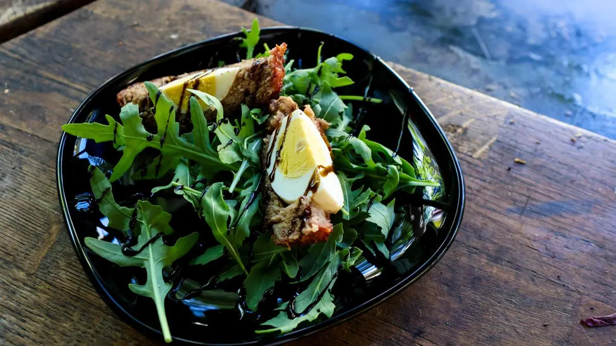 Eier aus dem Smoker nehmen und auf einem Blech abkühlen lassen. Scotch Eggs halbieren, mit Senf servieren.